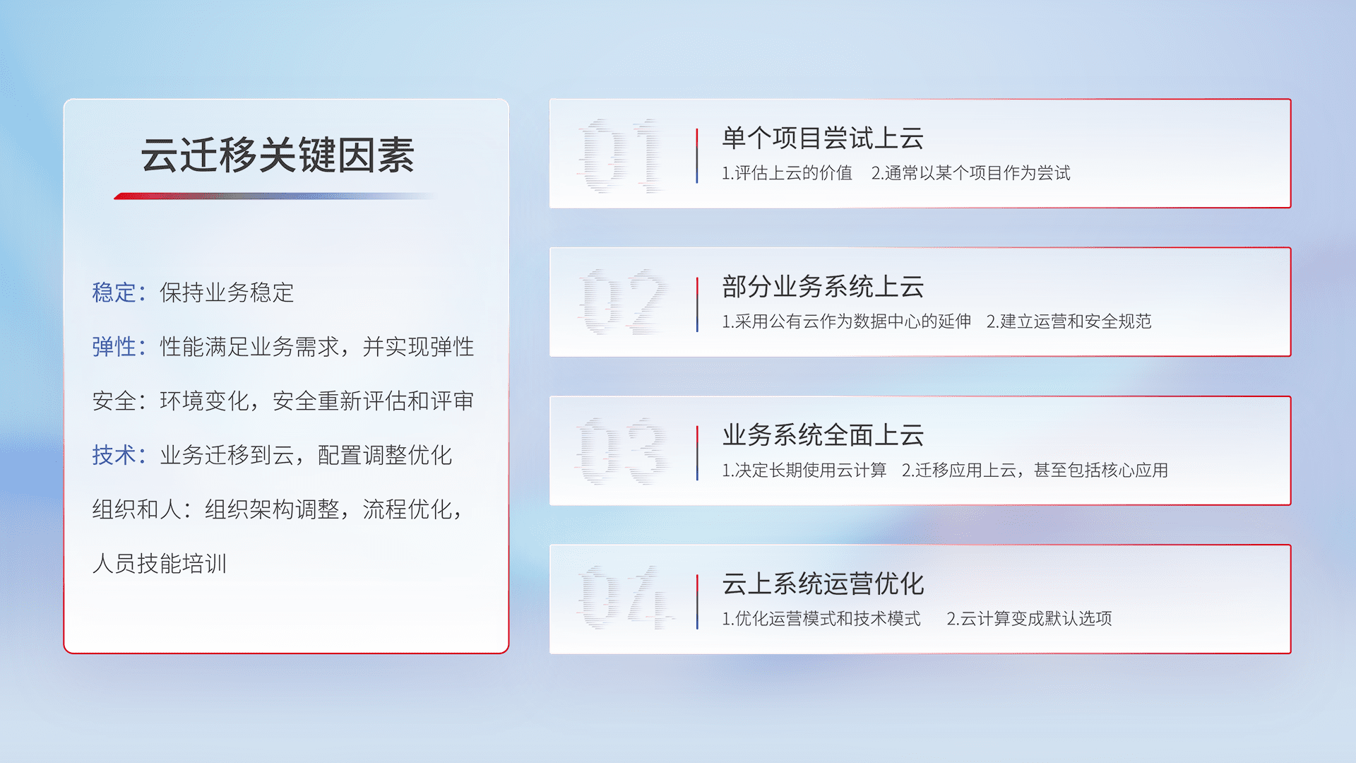 结合实际业务,,,,从规划设计、、、云平台选型、、、云原生改造、、、数据迁移、、、集成交付,,,迁移全过程为客户识别最佳上云路径,,做好风险识别管理,,,,设计网络架构、、身份权限、、安全审计合规、、、、操作审计、、日志审计、、、监控告警策略、、多站点容灾设计等,,,对云上基础设施进行整体规划,,,,提升IT治理水平,,,,以满足弹性、、、、高可用、、、高性能的需求。。