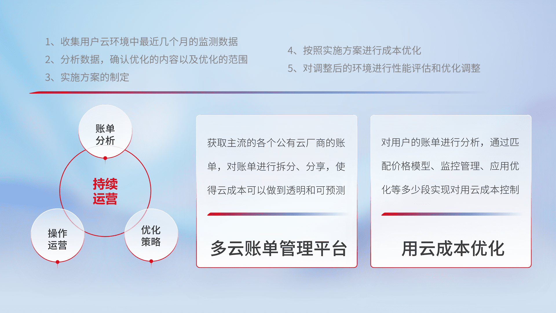 通过灵活运用多种自动化迁移工具,,,帮助企业用户实现业务和数据高效 、、、、稳定的上云迁移和云上迁移,,,采用自研多云纳管平台,,,以中立管理模式,,,,解决多组织、、、、多云、、、、多运维厂商的复杂关系的管理,,,保证多云平台资源配置的一致性,,,实时掌控云资源运行数据,,,运用智能化工具分析云资源多云平台的管理服务,,,,透明化管理成本支出,,,用云成本可预测、、用云费用可优化、、、云资源配额有据可依。。