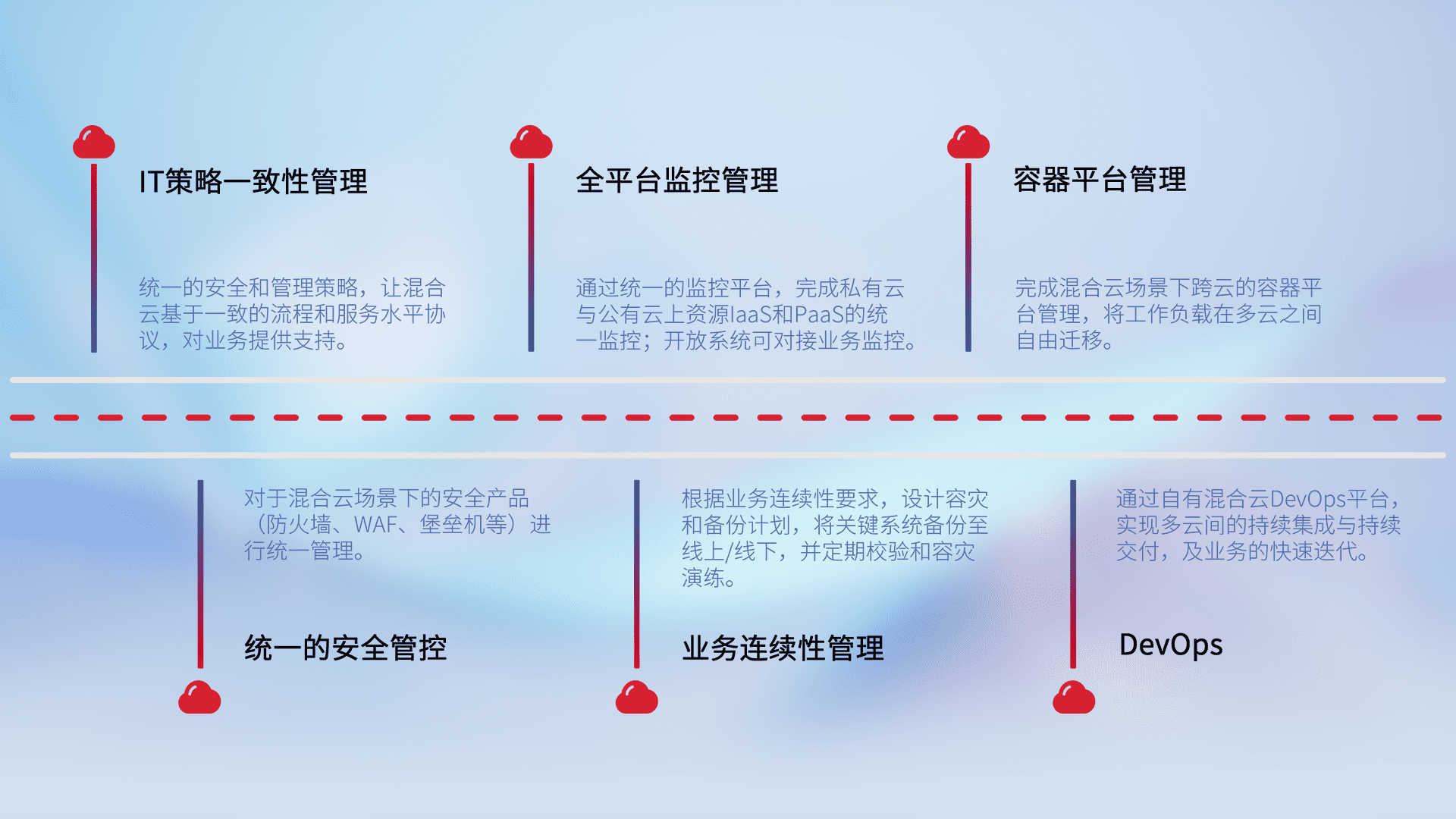 以中立管理模式,,解决多组织、、多云、、、多运维厂商的复杂关系的管理,,,,保证多云平台资源配置的一致性,,,,实时掌控云资源运行数据。。