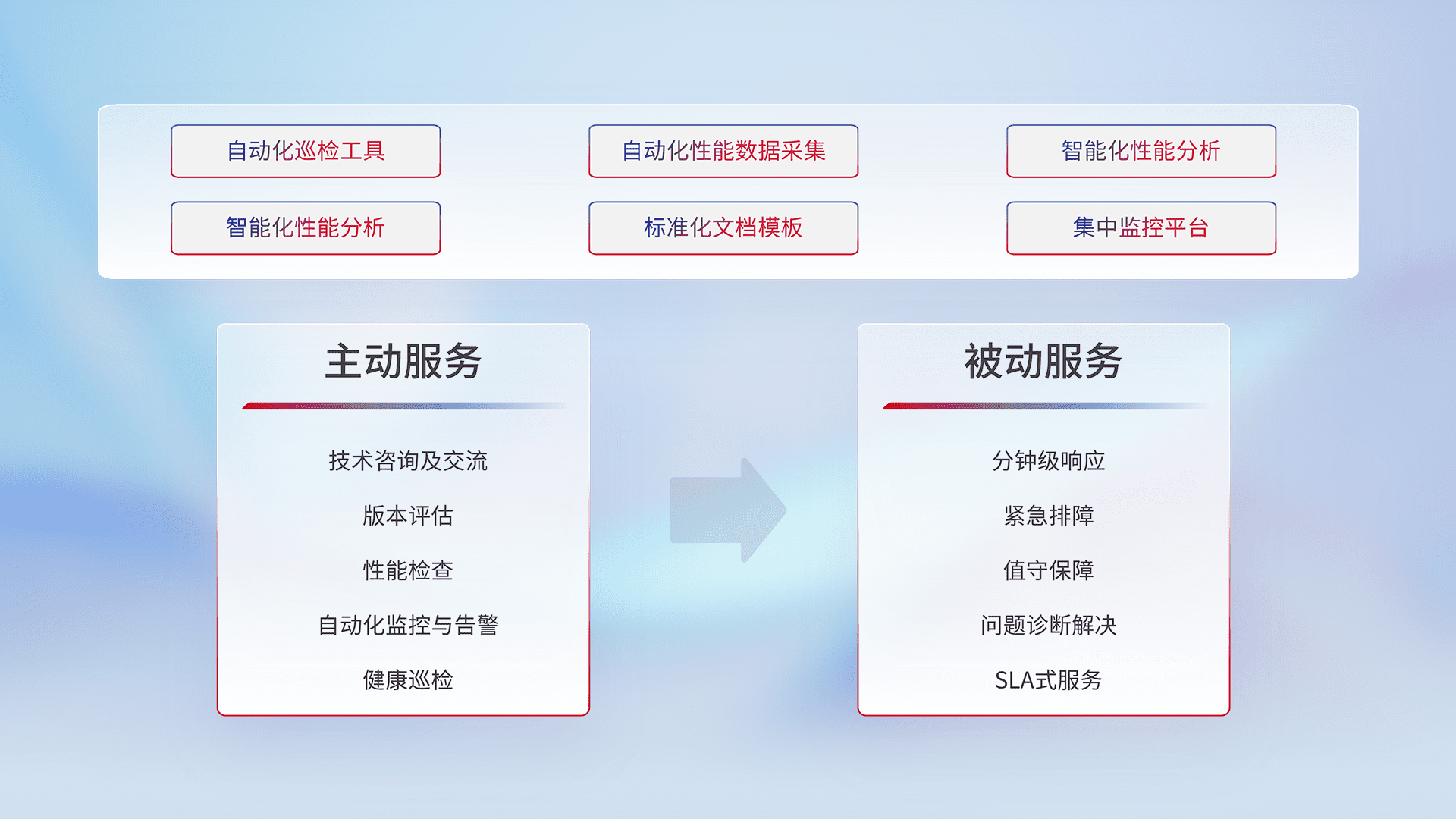 智能化工具和标准化文档,,,,保障服务质量,,,,提供主动服务(包含技术咨询、、、、版本评估、、、性能检查、、自动化监控与告警、、健康巡检)和被动服务包含(分钟级响应、、紧急排障、、、、值守保障、、、问题诊断解决、、SLA服务)。。。。