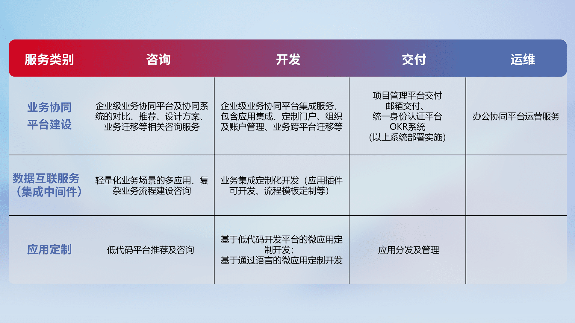 针对钉钉、、、、企微、、、、IDaas等平台级产品提供产品的规划、、、、方案、、交付、、定制化开发等服务,,,,实现如统一协同办公、、智能客户服务、、混合会议管理、、、、智能数据查询、、等业务场景,,实现数字化转型。。